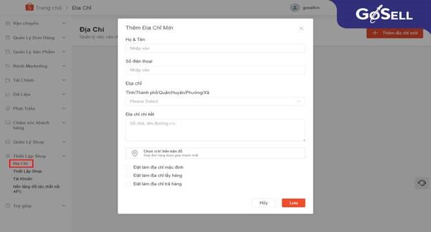 - Thiết lập địa chỉ shop bằng cách vào mục Thiết lập Shop -> Địa chỉ. Nhấn chọn Thêm địa chỉ mới ở góc bên phải và điền thông tin đầy đủ vào biểu mẫu, sau đó bấm Lưu.