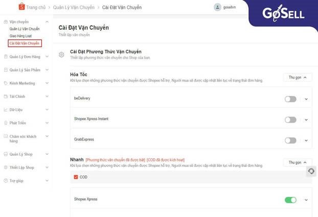 - Thiết lập vận chuyển bằng cách vào mục Vận chuyển -> Cài đặt vận chuyển. Tại đây bạn có thể chọn các phương thức vận chuyển tùy theo ý muốn, bao gồm có hình thức: Tiết kiệm, Nhanh và Hỏa tốc.